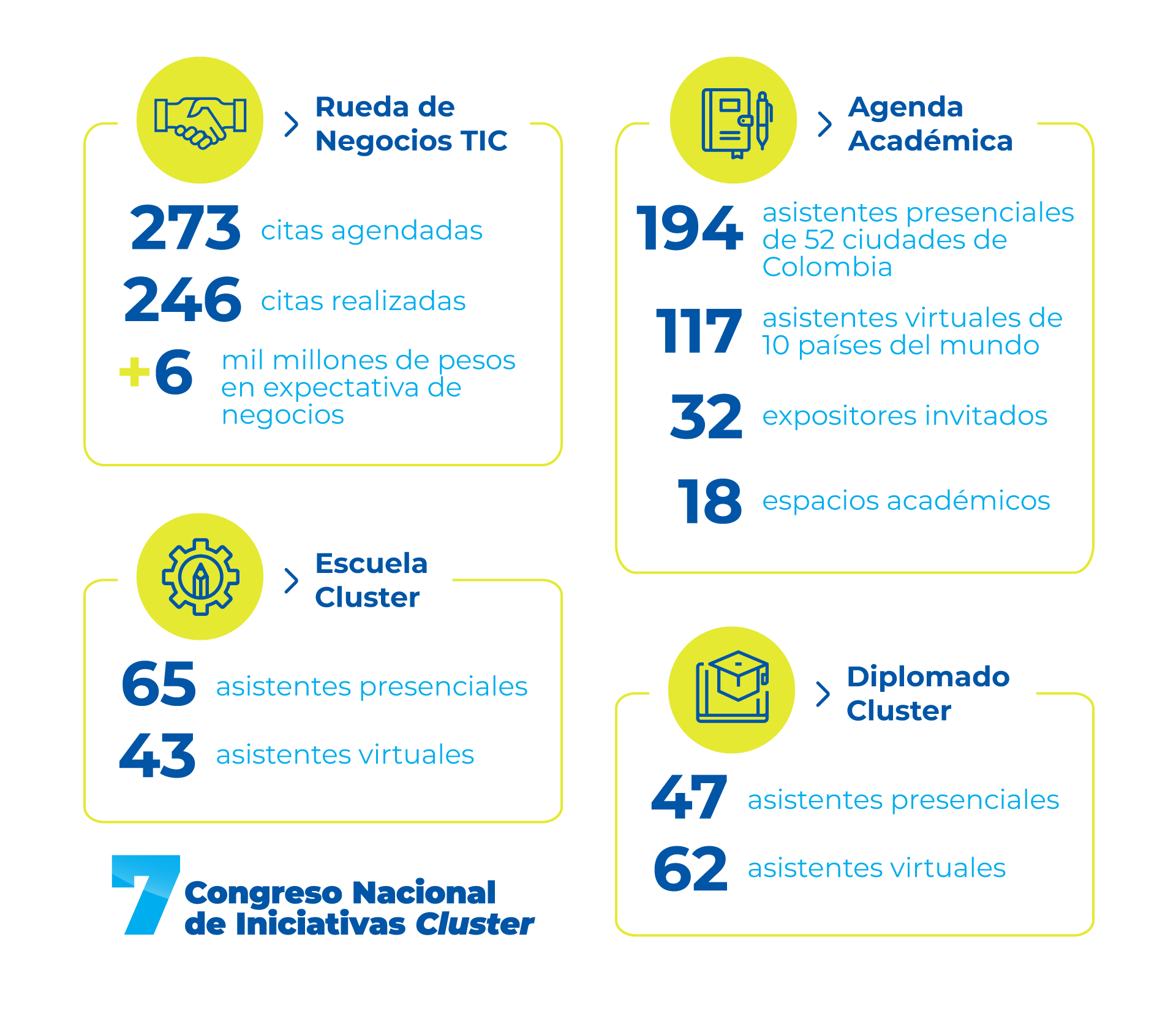 En el evento, realizado en la ciudad de Medellín, participaron importantes expertos nacionales e internacionales, quienes abordaron contenidos estratégicos relacionados con competitividad regional, productividad e innovación como herramienta de desarrollo empresarial, sin olvidar las herramientas que posibilitan la transformación de los clústeres. Algunos de los logros más importantes fueron los siguientes: