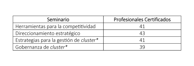 Confecámaras -a través de la Red Cluster Colombia- se ha preocupado por abrir diferentes espacios de formación con el objetivo de desarrollar competencias y brindar herramientas indispensables para la gestión de los diferentes profesionales vinculados con iniciativas clúster. Es así como este año, por ejemplo, 41 personas finalizaron el diplomado en Gestión Clúster.