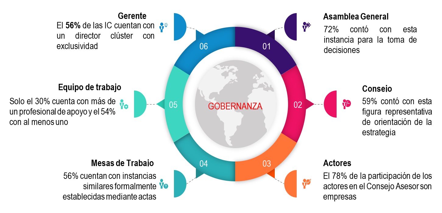 Uno de los aspectos más importantes para cualquier aglomeración productiva es la gobernanza, ya que evidencia el funcionamiento de las estructuras formales que permiten institucionalizar su trabajo, facilitando la toma de decisiones en condiciones de transparencia y la definición de estrategias para lograr su sostenibilidad.