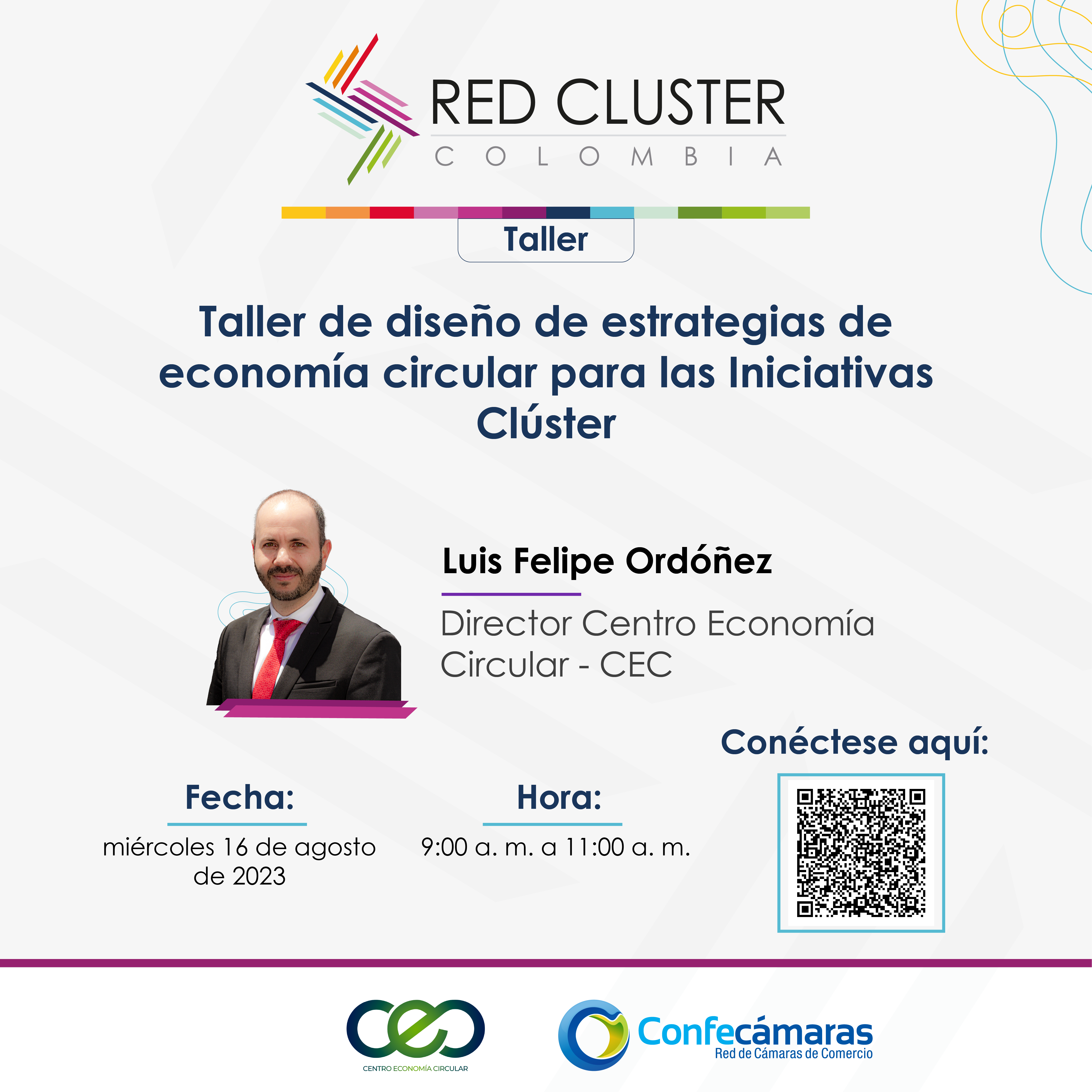 Como parte de las actividades de formación y fortalecimiento que adelantamos desde la Red Clúster Colombia para las iniciativas clúster, realizaremos el próximo miércoles 16 de agosto a las 9:00 am, el taller “Diseño de estrategias de economía circular para las iniciativas clúster” que dictará el Sr. Luis Felipe Ordoñez, director del Centro de Economía Circular. El enlace de conexión es https://n9.cl/9ok1d